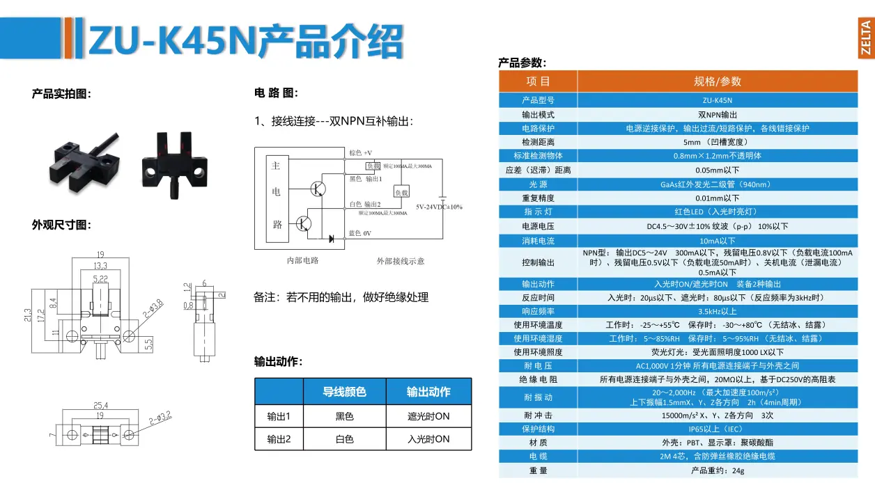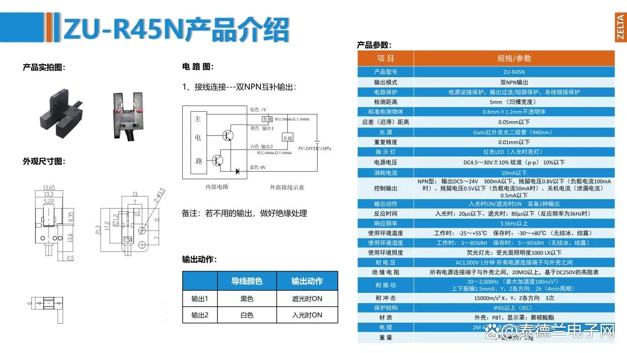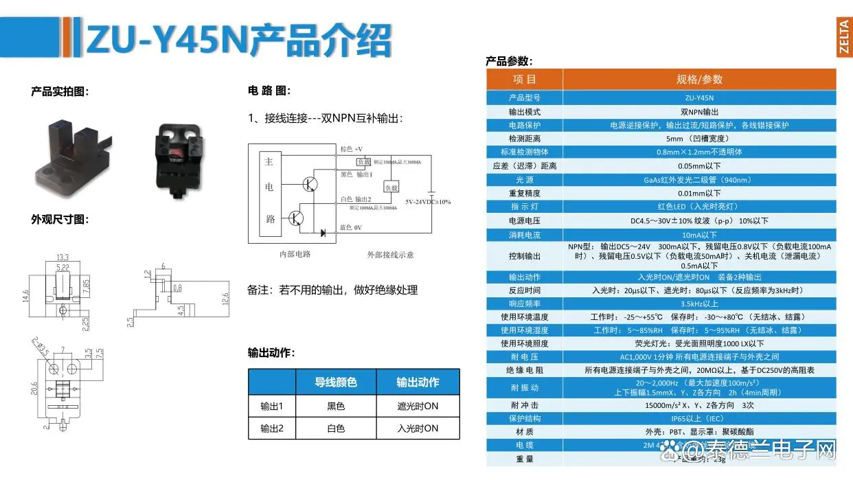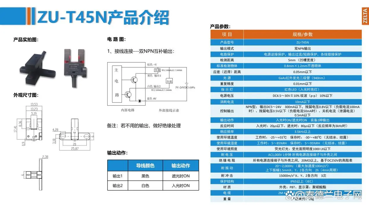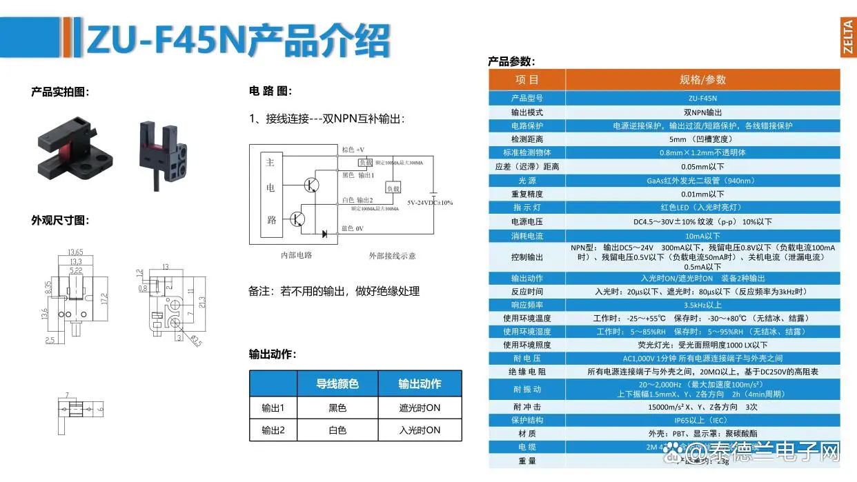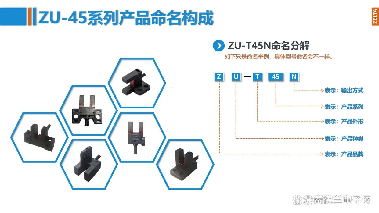 最近泰德兰电子随着业务扩展,不断拓宽电子元器件品牌代理线,目前泰德兰电子最新代理的槽型光电传感器品牌“Zelta助尔达”已经上线,前期主推Zelta助尔达ZU-45系列产品,涵盖型号有:ZU-T45N,ZU-R45N,ZU-K45N,ZU-L45N,ZU-F45N,ZU-Y45N六款产品,并且可以替换其他品牌同类产品,兼容性更强,性价比更高,(咨询电话:0755-83322522)下面小编就附上“Zelta助尔达”全系列产品介绍图如下: