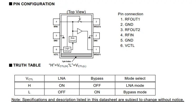 NJG1152KA1是主要用于地面数字电视广播设备的带有旁通功能的宽带低噪声增幅器(LNA)。工作频率为40~900MHz ,并实现了高增益、低NF等特性。内置有ESD保护元件,有高ES 耐圧特性。本产品采用了无铅、无卤化物、符合RoHS 规格的FLP6-A1 封装。
