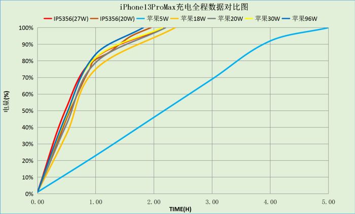通过与苹果原装适配器的充电速率对比图可以看出,英集芯IP5356跟原装30W苹果原装适配器对比,曲线几乎重合,完美支持iPhone 13 ProMax 27W快速充电。