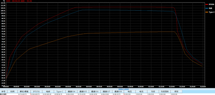 安全性方面,在不使用外部NTC电路条件下,在满功率27W输出接近35分钟后,IC智能温度环监测到温度达到阈值110℃时,会主动缓慢降低输出功率,使得温度趋于稳定不再升高。